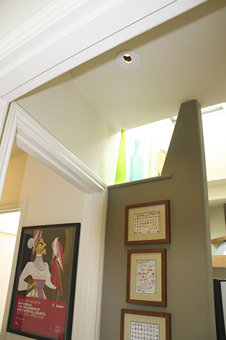 Even though this is the bathroom section of the site, you're looking through the kitchen to the hall outside the bathroom. That is the open door to the bathroom in the very lower left hand corner. The Falconer is on the wall of the hall just outside the bathroom. The interesting green section of wall with the glass bottles on the shelf actually covers the refrigerator. We added a recess light with a wall washer trim to throw light on the framed Tibetan cards that the client wanted to display. This was a "while you are here...... mini project." When I called to set up photographing the bathroom. the client mentioned this little add-on as something that brings her pleasure every day. When you remodel you need to remember you deserve joy and ease and comfort from your home. You need to realize you deserve the one thing that goes over budget, like the really cool sconces, or a little spot light on something that triggers a memory and brings you joy.