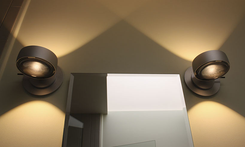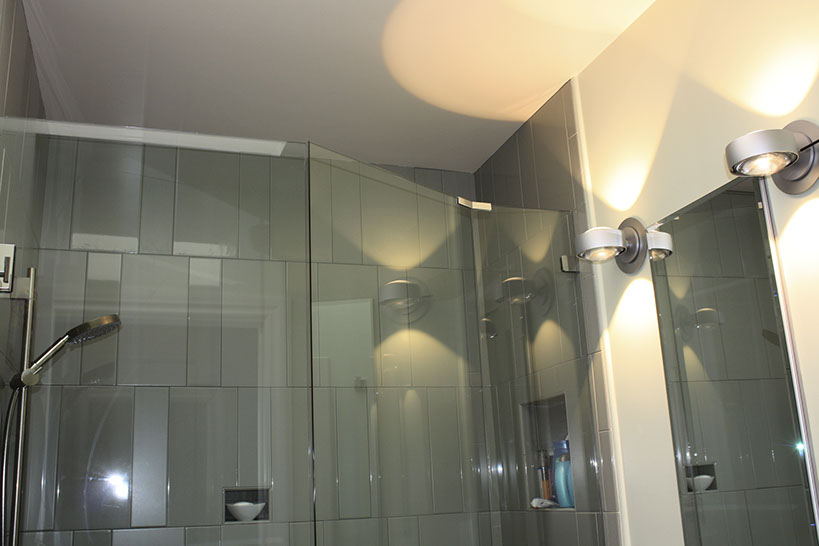 So when the client set out selecting materials, she did so armed with an Allowance for each item as part of my proposal. It comes on a separate sheet called "Owner Provides." In her project it was the plumbing fixtures, tile, vanity, medicine cabinet, bath hardware, and these light fixtures. She hit all of the usual suspects' stores, including the internet. She wound up buying everything, but these two multi color LED sconces at Floorcraft. She was under the allowance on every item. The lighting fixture allowance was $750. She really loved these fixtures. And they make the room. She told me they were $1100.00. "That's not much over", I said. Then she said "Each."