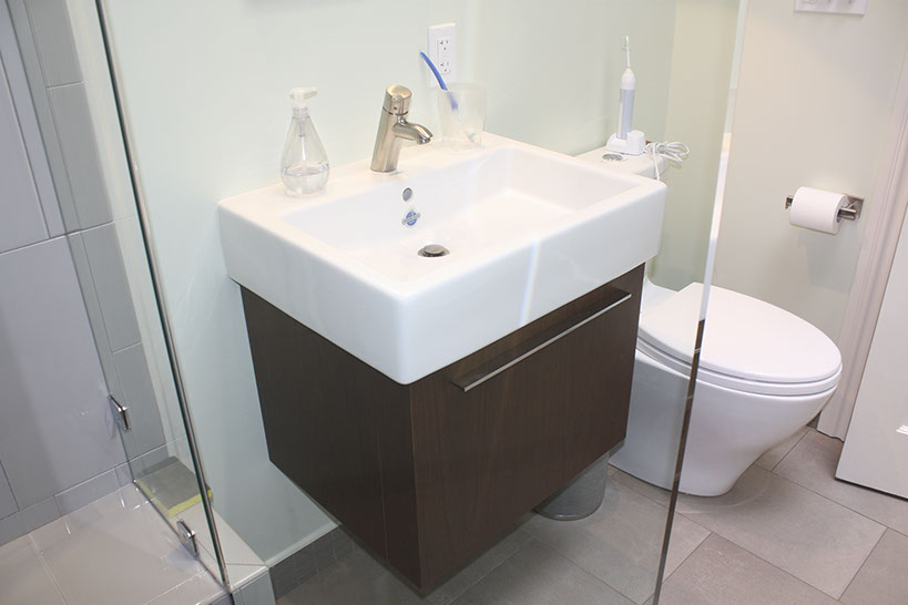 "Designing for the house keeper 101." That narrowing of the shower by the vanity put enough room between the vanity and the glass of the shower enclosure that both stay clean. The floating vanity provides storage and still allows the mop to glide under unimpeded. The round front toilet keeps it from peeking out into the door way. And the tile bench is tilted slightly down hill in the front to have the water slide off onto the floor of the shower. If you keep the glass away from the edge of the curb, the outside can get a good scrubbing with resorting to an old tooth brush. If a bathroom is designed correctly it is easy to maintain. After all it is the most frequently-cleaned room in the house. These photos were shot a little over a year after we completed the project.
